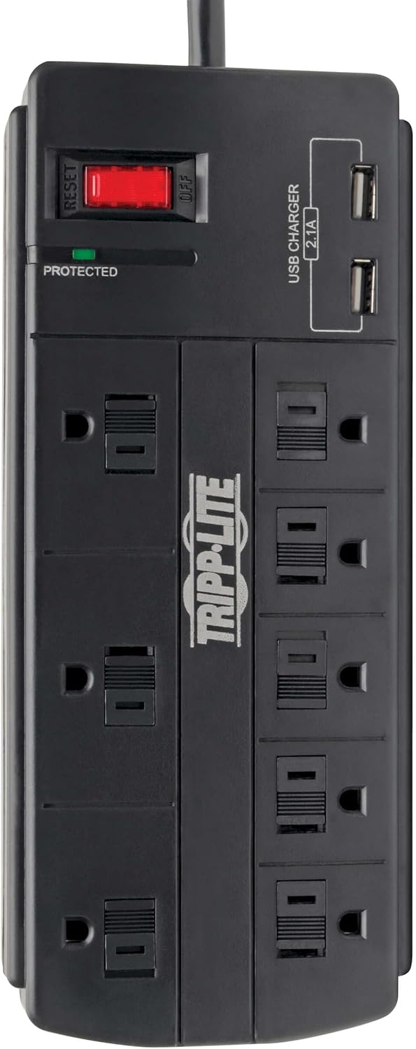 Tripp Lite Surge Protector with USB Charging, 8 Outlet Surge Protector Power Strip, 2 USB Charge Ports, 8ft Cord, 1200 Joules, Black (TLP88USBB)